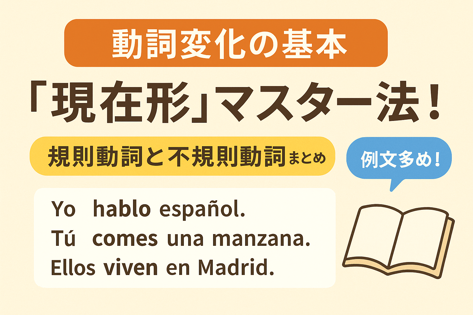 スペイン語の現在形動詞変化を徹底解説!規則動詞と不規則動詞の違いをわかりやすくまとめ、例文付きで学習に役立つ内容です。
